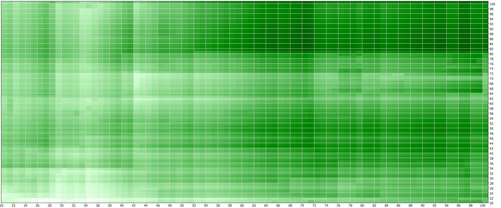 Zones de chaleurs sur le ratio gain / perte optimum (Horizontal : objectif / Vertical : Stop loss)