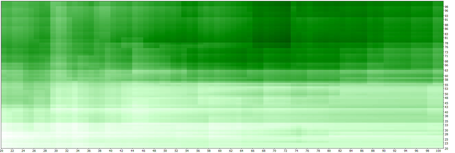 Zones de chaleurs sur le ratio gain / perte optimum (Horizontal : objectif / Vertical : Stop loss)